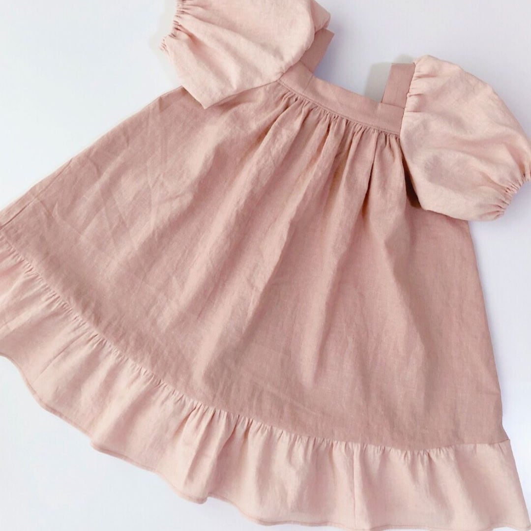 くったりしなやかなハーフリネンの生地を使用し、広めの襟ぐりとボリュームのある袖、ふんわりと広がる裾がとても可愛らしいワンピースです。